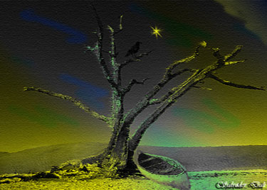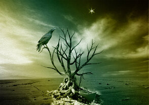 12) Поработаем кистями. (Помните, чтобы применить к разным кистям различные эффекты, создавайте их на отдельно взятом слое, иначе настройки будут применены ко всем кистям, расположенным на одном слое!). Возьмите кисть Звезда и зажгите звезду высоко в небе. Теперь возьмите кисть Птицы и посадите Ворона на ветку, чтобы он мог любоваться звездой.