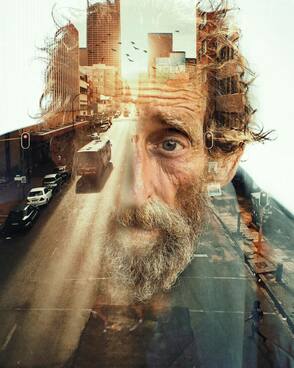 В этом шаге мы создадим эффект двойной экспозиции, добавив изображение города, и соединим его с изображением пожилого мужчины, используя режимы наложения. Также, в этом шаге вы можете поэкспериментировать, добавляя разные фотографии, чтобы получить нужный для вас результат. Поэтому не бойтесь выбирать разные изображения, которые вам нравятся – это может быть город, ручей, лес или любое другое изображение.