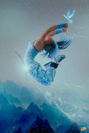 Примечание переводчика: при прорисовке кожи голубы цветом снизьте непрозрачность кисти, примерно до 50%, для достижения нужного эффекта. Так же автор создает еще один слой, меняет режим наложения на Перекрытие (Overlay) и белой мягкой кистью осветляет верхнюю часть изображения и частично горы.