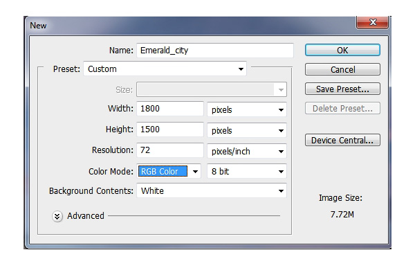 Для начала создаем документ размером 1800 х 1500 пикселей со следующими настройками: