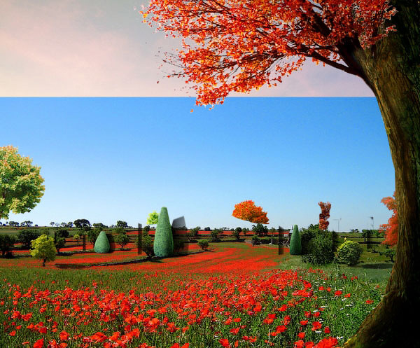 Открываем картинку с маками и вставляем ее над слоем с воротами. С помощью маски удаляем лишний фон и создаем плавный переход между маковым полем и травой.