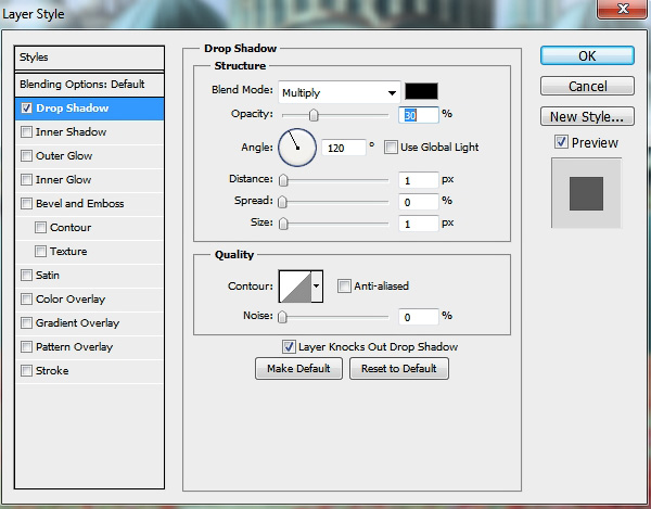 Дважды кликаем по слою с орнаментом и применяем Drop Shadow (Тень):