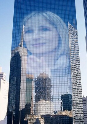Установите слой с женским портретом над слоем с изображением фасада с окнами.