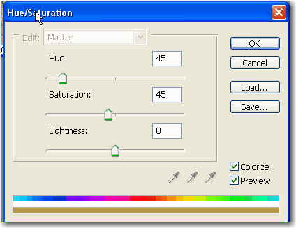 Отметьте галочкой Тонирование (Colorize) и установите вот такие значения: