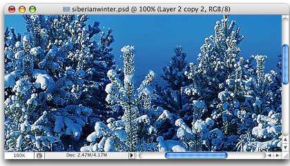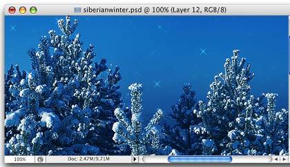 Примените фильтр Filter – Sharpen – Sharpen (Фильтр – Резкость – Резкость). Используя комбинацию Ctrl + F, повторите действие несколько раз, пока снег не приобретёт лёгкое свечение.