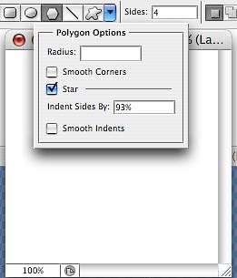 Или, вы можете сами создать кисть. Для этого создайте новый документ размером 200х200 пикс. Выберите инструмент Polygon (многоугольник), количество сторон (Side) установите 4, а в настройках фигуры Polygon options установите indent (глубина лучей) равный 93. У вас получится звезда.