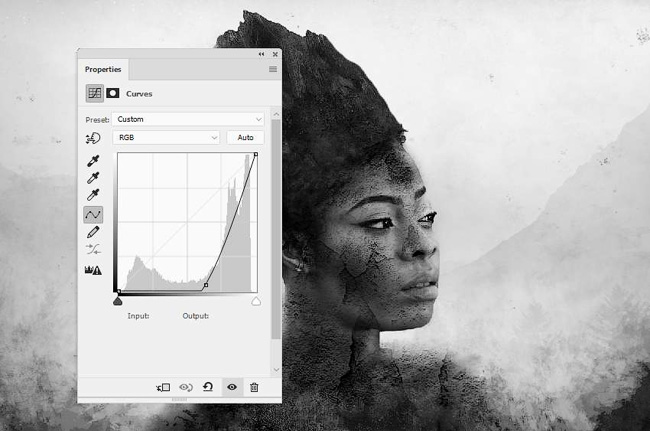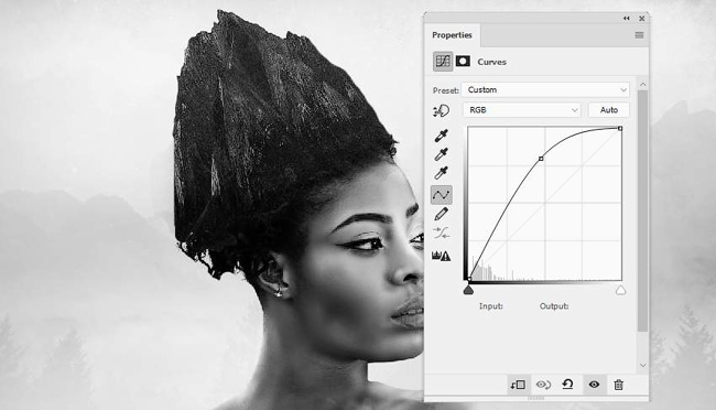 Добавляем корректирующий слой Curves (Кривые) и увеличиваем контрастность горы.