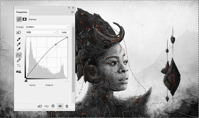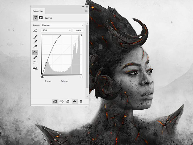 С помощью корректирующего слоя Curves (Кривые) осветляем эффект лавы на щеке и плече модели, так как в этих местах он получился слишком темный.