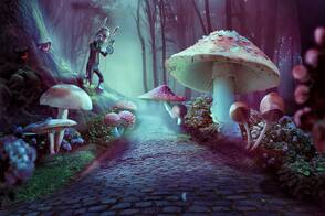 Сначала, используя несколько стоковых фото, мы создадим основу композиции. После этого добавим цветы и растения, создадим дерево, вставим грибы и объединим все это с помощью корректирующих слоев, масок и кистей. Далее мы добавим кролика и глаза на дереве. Также нарисуем легкий туман, чтобы усилить волшебную атмосферу композиции. В конце мы выполним цветокоррекцию с помощью нескольких корректирующих слоев.