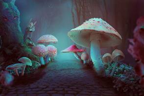 Сначала, используя несколько стоковых фото, мы создадим основу композиции. После этого добавим цветы и растения, создадим дерево, вставим грибы и объединим все это с помощью корректирующих слоев, масок и кистей. Далее мы добавим кролика и глаза на дереве. Также нарисуем легкий туман, чтобы усилить волшебную атмосферу композиции. В конце мы выполним цветокоррекцию с помощью нескольких корректирующих слоев.