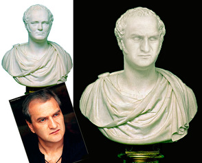 Дублируйте слой с актером и скройте дубликат (в дальнейшем он нам понадобиться). Уменьшите Непрозрачность (Opacity) слою и поместите изображение так, чтобы подбородок актера и статуи совпал. Немного уменьшите лицо актера в размере (Ctrl+T).