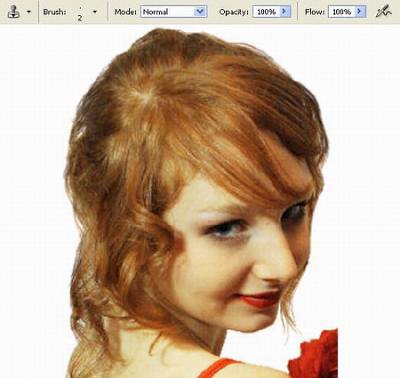 (Stamp) с кистью в 2 пикселя и пройдитесь им по волосам девушки, чтобы придать им более живой вид.