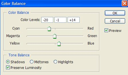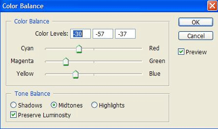 Далее Layer > New Adjustment Layer > Color Balance (Слой > Новый корректирующий слой > Цветовой баланс (Ctrl+B)).