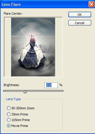 Теперь Filter > Render > Lens Flare (Фильтр > Рендеринг > Блик). Не забудьте перед этим опуститься на предыдущий слой, иначе блик у вас работать не будет.