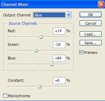 Далее опять Layer > New Adjustment Layer > Channel Mixer (Слой > Новый корректирующий слой > Микширование каналов). Устанавливаем такие же значения.