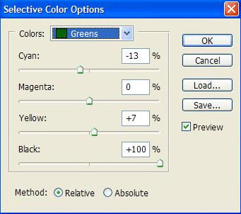 Опять Layer > New Adjustment Layer > Selective Color (Слой > Новый корректирующий слой > Выборочная коррекция цвета), выберите зеленые и голубые цвета для этого. Ориентируйтесь по табличкам представленным ниже.