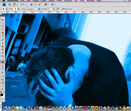 Шаг 11. Переходим на слой с парнем. Выбираем инструмент «Dodge» (Осветлитель), режим Highlights (Света), exposure (экспозиция) 5% и осветляем участки кожи на открытых частях тела - на шее и руках.
