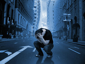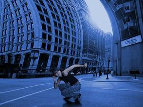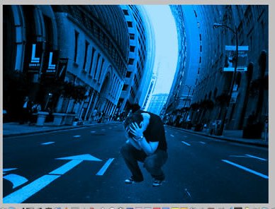 Шаг 4. Переходим на слой с городом и займёмся зданиями. Для этого Edit/Transform/Warp (Редактирование /трансформирование /Деформация). Создайте интересное искажение города. Создавая искажение, помните об одной важной вещи – часть улицы (на уровне середины фигуры парня и до самого низа) должна оставаться недеформированной.