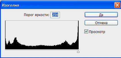 Можно узнать, какие области изображения лишены информации о цвете, с помощью команды Изогелия (Threshold). Для этого нужно либо вызвать команду через меню Изображение – Коррекция – Изогелия (Image – Adjustment – Threshold), либо создать соответствующий корректирующий слой. Затем в диалоговом окне команды сдвинуть ползунок к значению светов, в пределах 250-255. Белые области будут указывать на отсутствие пикселей ниже этого значения в изображении. Значение 255 говорит о полном отсутствии окрашенных пикселей.