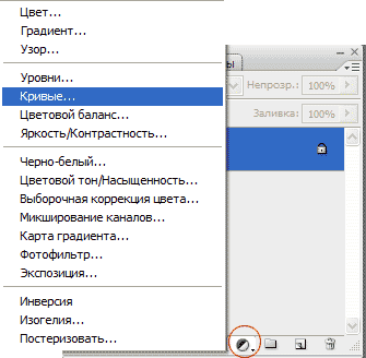 Шаг 3. Создаем корректирующий слой Кривые (Curves). Для этого щелкнем по черно-белому кружочку внизу палитры слоев