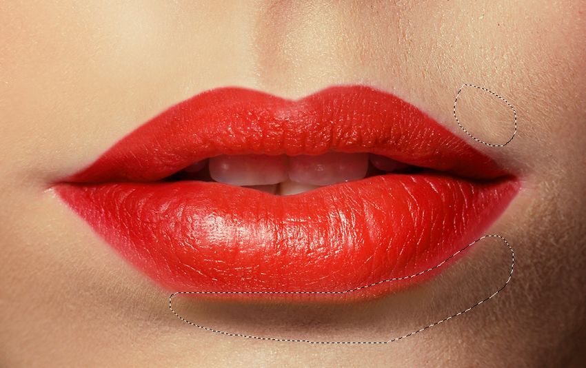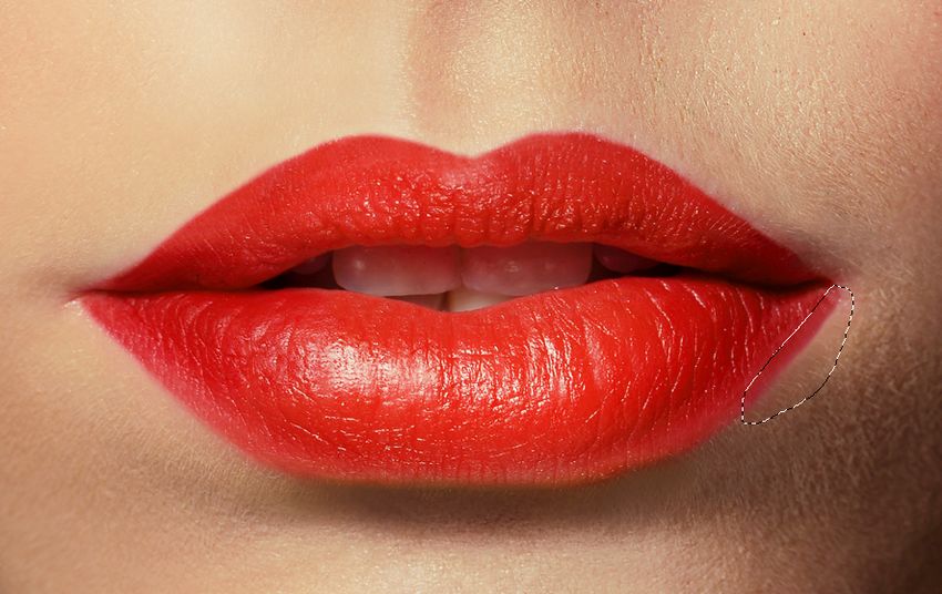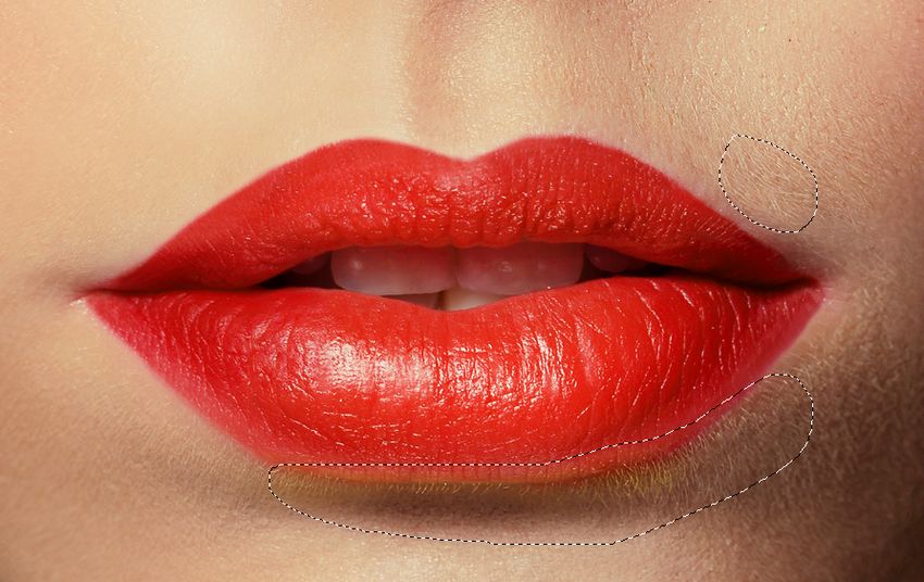 Обработанная область получилась слишком светлой, поэтому нужно увеличить интенсивность теней под губой. С помощью Lasso Tool (L)