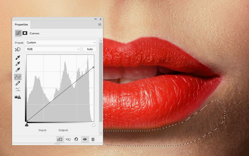 (Лассо) выделаем область под губой и переходим Layer – New Adjustment Layer – Curves (Слой – Новый корректирующий слой – Кривые). В открывшемся окне ставим галочку напротив Use Previous Layer To Create Clipping Mask (Использовать предыдущий слой для создания обтравочной маски) и жмем ОК. Уменьшаем яркость до тех пор, пока тень не станет темнее.
