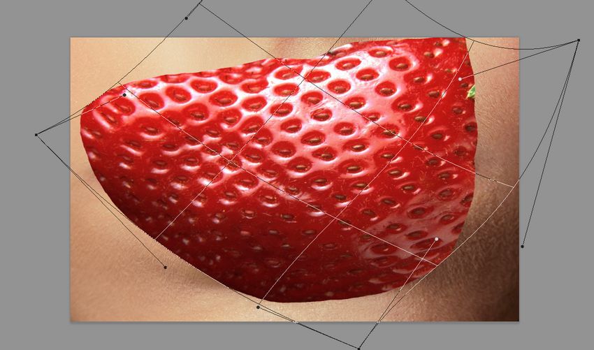 Теперь выделяем нижнюю часть клубники и добавляем ее на верхней губе. Активируем свободную трансформацию (Ctrl+T) в режиме Warp (Деформация) и придаем текстуре дугообразную форму, повторяя форму верхней губы. Самую освещенную часть текстуры тянем немного левее, чтобы она повторяла освещение модели.
