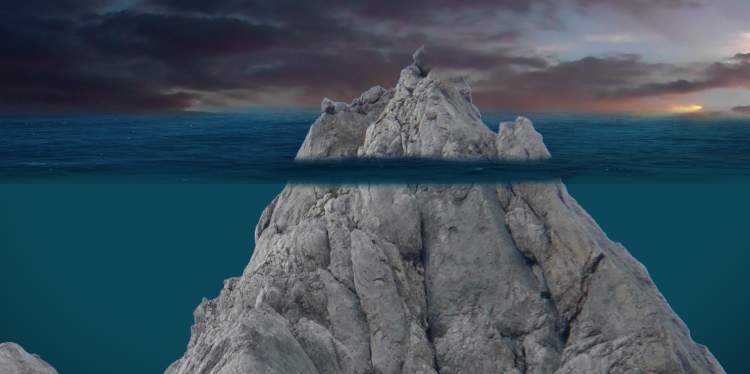 Вырезаем скалу и размещаем ее под слоем с водой. С помощью свободной трансформации (Ctrl+T) поворачиваем скалу так, чтобы ее вершина смотрела вверх. Добавляем на этот слой маску и черной кистью средней жесткости скрываем часть горы так, чтобы создать эффект частичного погружения в воду.