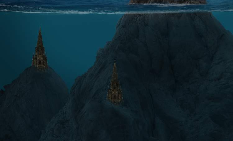 Открываем картинку с замком 3 и вырезаем самую высокую башню. Копируем и добавляем ее на разных участках горы под водой. Дорабатываем края с помощью маски, чтобы объединить башни с горой.