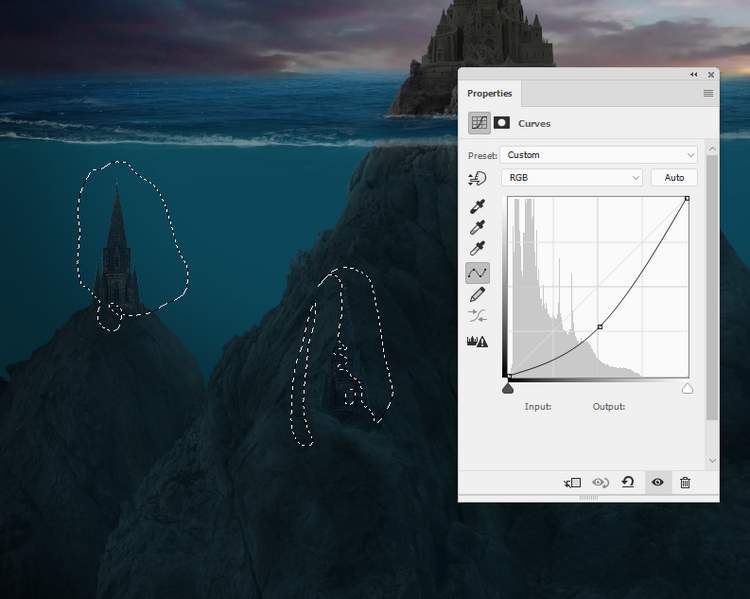 С помощью корректирующего слоя Curves (Кривые) затемняем гору, особенно подводную часть. В верхней части скалы скрываем эффект корректирующего слоя.