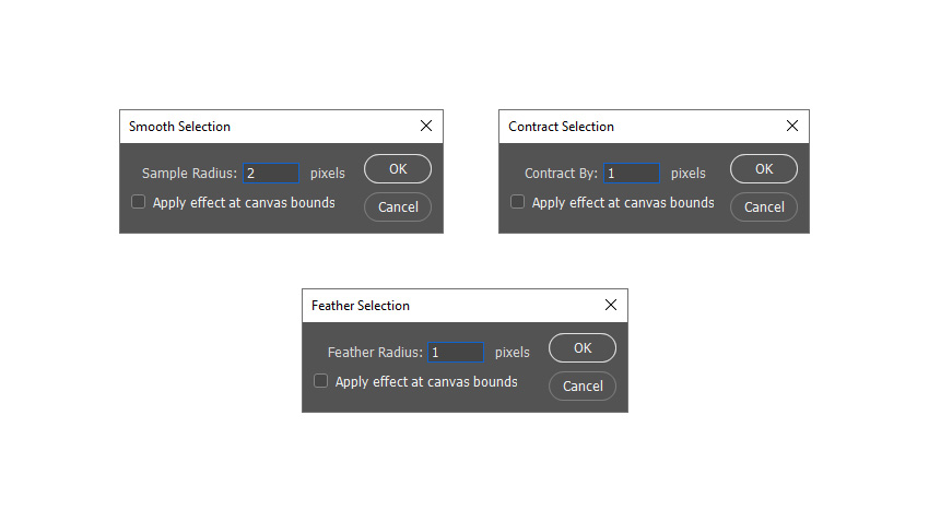 Идем в меню Select — Modify — Smooth (Выделение — Модификация — Сгладить) и устанавливаем Sample Radius (Радиус) на 2 px. Далее и устанавливаем Select — Modify — Contract (Выделение — Модификация — Сжать) и устанавливаем Contract By (Сжать на) на 1 px. Наконец, идем в Select — Modify — Feather (Выделение — Модификация — Растушевка) и устанавливаем Feather Radius (Радиус растушевки) на 1 px.