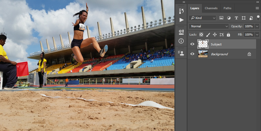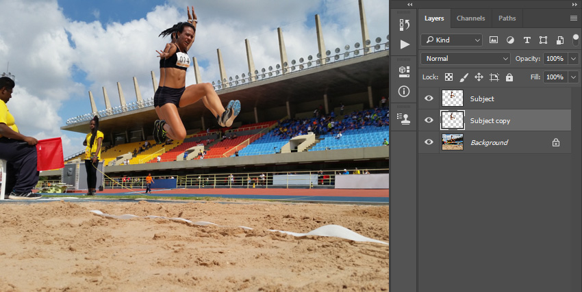 Дублируем этот слой и перетаскиваем копию под слой Subject (Объект) на панели слоев. Берем инструмент Move Tool