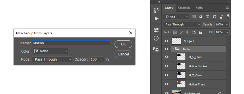 Теперь выбираем слой Motion Trace (Трассировка движения), зажимаем Shift и кликаем по слою M_S_Glow (Свечение_2), чтобы выделить все слои между ними. Идем в меню Layer — New — Group from Layers (Слои — Новый — Группа из слоев), чтобы создать новую группу из слоем, называем ее Motion (Движение).