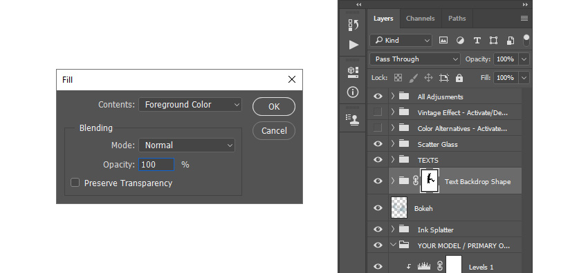 Ctrl+клик по миниатюре слоя Subject copy (Объект копия), чтобы загрузить выделение. Выбираем слой Splash (Брызги) и идем в меню Edit — Fill (Редактирование — Выполнить заливку), и устанавливаем Contents (Содержание) на Foreground Color (Основной цвет), Mode (Режим) на Normal (Нормальный), Opacity (Непрозрачность) на 100%.
