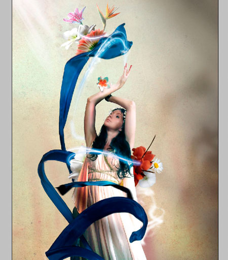 Шаг 14. Заканчиваем творить. Нам нужно всего лишь добавить пару деталей, чтобы сделать наше изображение более привлекательным. Например, добавим несколько лепестков для украшения. Также добавьте парочку цветов, парящих в воздухе. Для создания эффекта движения, используйте Размытие по Гауссу.