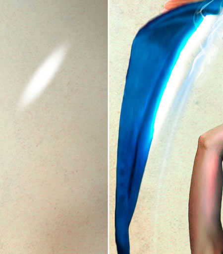 Шаг 12. Добавим лучи света, которые будут исходить и руки девушки. Чтобы это сделать, возьмите жесткую кисть размером 8 px и поставьте белый фоновым цветом. Теперь возьмите Перо Pen Tool