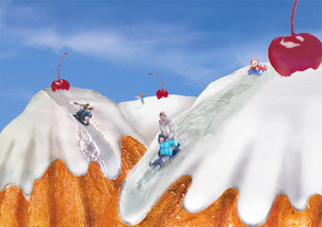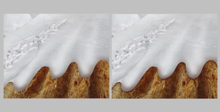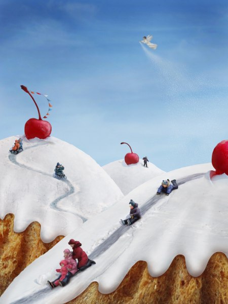 Теперь нашим пирожным понадобится «глазурь». Для этого используем фотографии зимних пейзажей, поскольку нам важна фактура снега. Накладываем картинки со снегом поверх кексов, деформируя изображения, чтобы дорожки на снегу изогнулась должным образом.