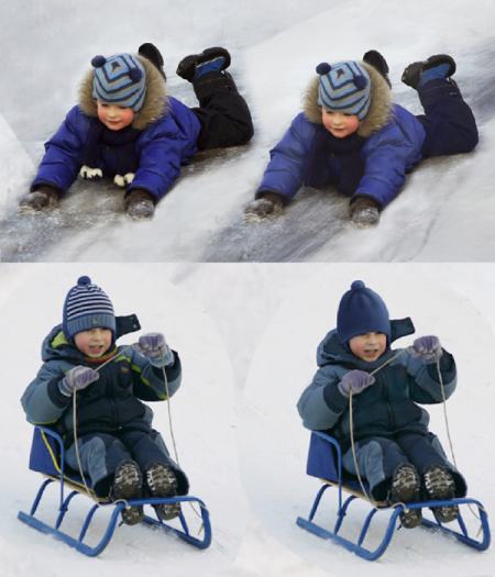 средней жёсткости (регулируем настройки, нажав правую кнопку мыши или соответствующую клавишу на планшете), стираем края нового фрагмента таким образом, чтобы мягко вписать ледяную дорожку в общий фон. Далее по ходу работы нам несколько раз придётся переносить на картину объекты вместе с кусочками снежного фона, и может возникнуть следующая ситуация. Снег на разных слоях, как нам и нужно, сливается друг с другом, а объект выглядит недостаточно ярким. В таких случаях я создаю копию слоя с новым объектом, нижний слой немного осветляю, а верхний протираю выборочно мягким ластиком (к примеру, ребёнок в тёмной одежде становится светлее, снег же вокруг него неизменно вписан по яркости в фон)
