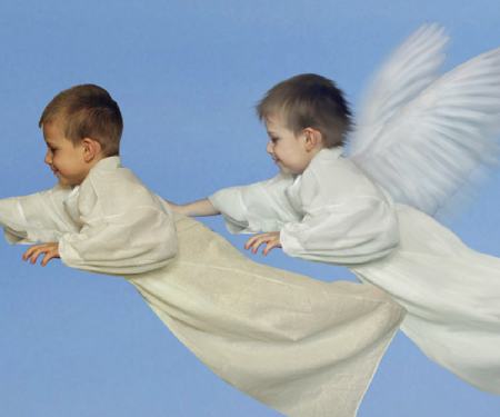 Переносим на слой с небом ангела. Это фотография ребёнка, позировавшего на стуле. Снимок был сделан в комнате на скорую руку при недостаточном освещении, отсюда зерно на тёмном участке (волосы). Для нас же это не играет особой роли. Выправляем ползунками цветовой баланс. При помощи инструмента Палец/Smudge
