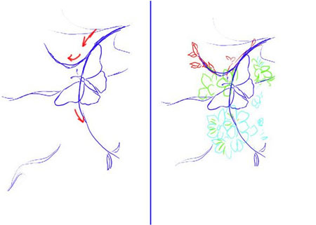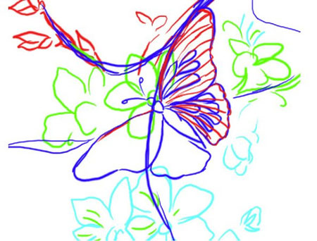 Для начала создаем новую группу "цветы" между группой "бабочка" и "скетч". После этого создаем в группе новый слой и называем его "контур". Начинаем обводить контур цветов (убедитесь, что opacity (непрозрачность) и flow (нажим) кисти установлены на 100%).