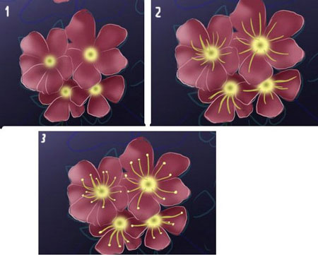 (Чтобы создать светящийся эффект, уменьшаем opacity (непрозрачность) до 20% и размер до 15px, рисуем по краю цветов, затем размываем их)