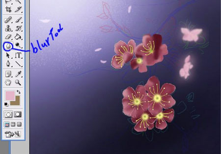Шаг 23. Размываем новые цветы с помощью Blur Tool