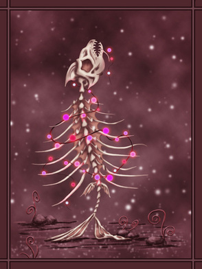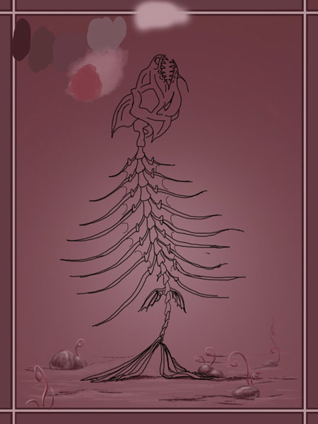 На этом этапе мне важно понять, в какой части листа будет стоять ёлка, в какой позе, сколько места она займет на листе, какие ее основные пропорции и какие составные части у нее будут. Здесь очень приблизительно видно, что это скелет рыбы, что у него есть ребра, пластинки, скелет, череп и плавники. А так же видно, сколько места остается до краев листа. Вроде бы мы никуда ощутимо не съехали – ни вверх, ни вниз, ни в стороны.