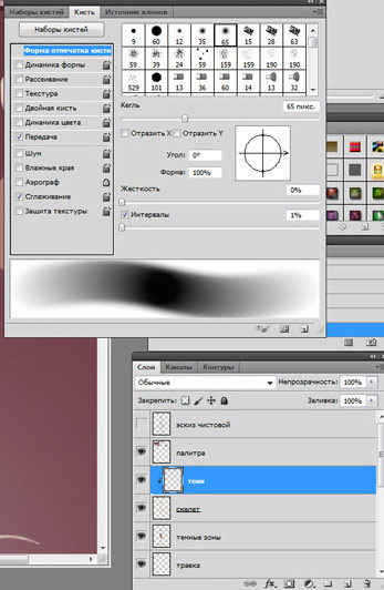 Настраиваю кисть, снова включив динамику формы (Shape dynamics). Начинаю закрашивать скелет, стоя на соответствующем слое. Не перепутайте слои, не начните красить слой с эскизом!