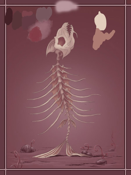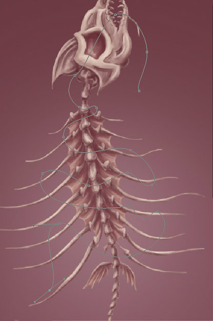 Пробегаюсь несколькими мазками по тем частям скелета, которые у глубже остальных – основание черепа, позвоночник, начало и конец ребер. Такую же процедуру с созданием нового слоя Тени провожу для темных зон скелета. Затемняю глаз, плавники возле костей.