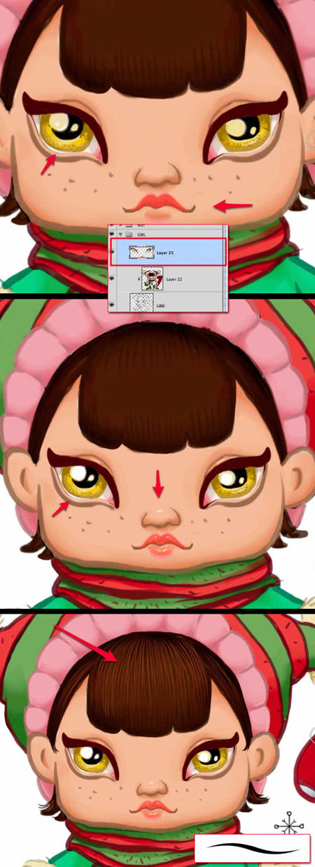 Теперь мы добавим цветовые оттенки. Во-первых, каждый цветовой оттенок наносите на отдельный слой ниже слоя Line. На этом этапе, вам нужно сохранить все слои по папкам, чтобы сохранить порядок в палитре слоёв. (Примечание переводчика: 1. слой с текстом в папку ‘текст’, слои с девочкой в папку ‘Девочка’ и т.д. 2. Слой Line – это слой с контуром изображения девочки). Т.к. мы рисуем Рождественскую открытку, то будет лучше использовать оттенки красного и зелёного цвета в качестве преобладающего цвета.