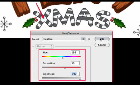 Увеличьте видимость слоя со словом “XMAS” до 100%, далее, нажмите клавиши (Ctrl-U) для активации цветовой коррекции Цветовой тон / Насыщенность (Hue/Saturation), в окне настроек, измените цвет на светло-голубой.