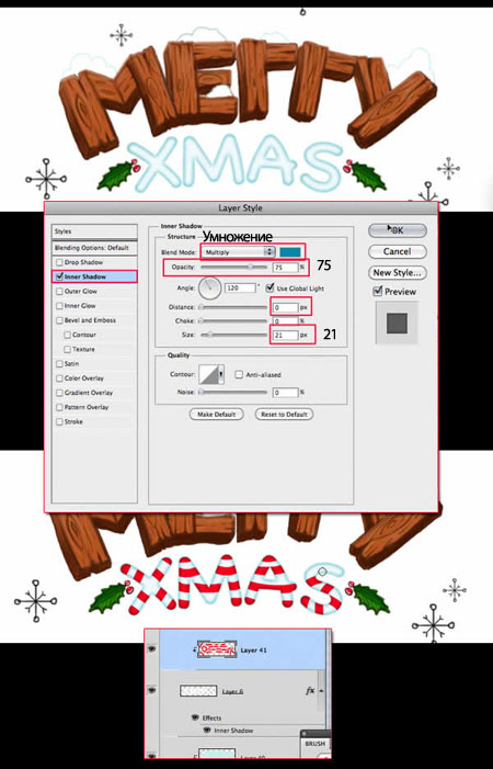 Примечание переводчика: к цветной заливке слова “XMAS” примените стили слоя Внутреннюю тень (Inner Shadow). Далее, создайте новый слой поверх слоя со словом “XMAS” в качестве обтравочной маски.