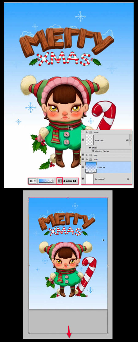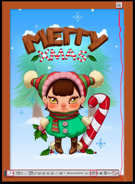 Добавьте детали: к ботиночкам, световые блики к красным ягодкам омелы, прожилки на листьях, детали к курточке и помпонам, везде, где вы считаете нужным, чем больше, тем лучше. Нарисуйте тонкую белую линию сверху на каждом участке изображения.