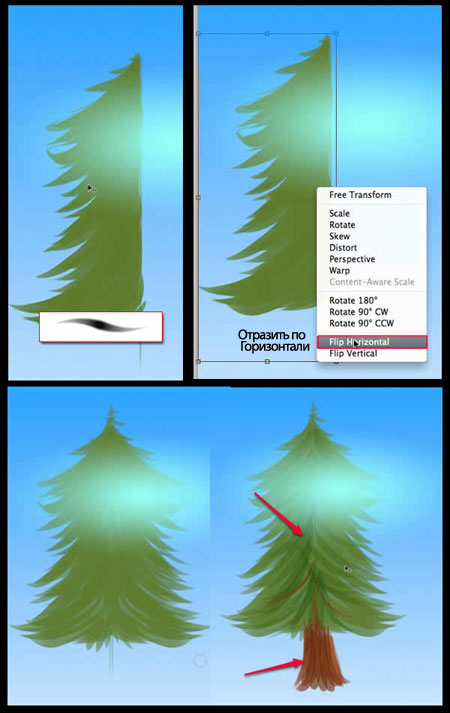 Отключите видимость слоёв с девочкой и текстом. Создайте новый слой. Выберите кисть средней жёсткости, в настройках кисти установите контроль на нажим пера, включая режим Переход (transfer), нарисуйте ёлочки свободными штрихами. Продублируйте слой, а затем Отразите по Горизонтали (Flip Horizontal). Объедините оба слоя, добавьте к ёлочке детали. Нарисуйте ствол у ёлочки, а также ветви, используя тёмно-зелёный цвет.